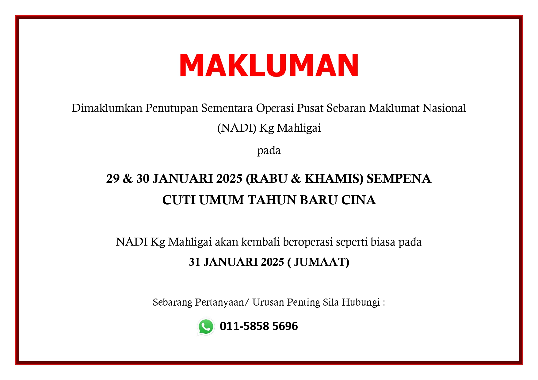 Notis Penutupan Sementara NADI Mahligai Sempena Cuti Umum Tahun Baru Cina