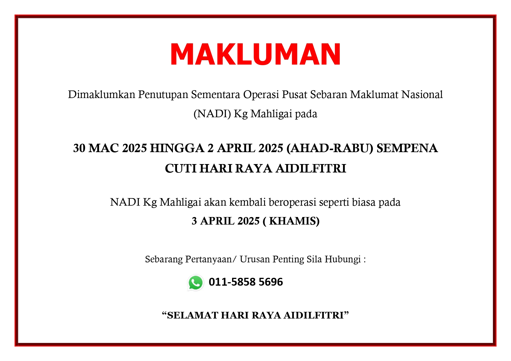 Notis Penutupan Sementara Operasi NADI Mahligai Sempena Cuti Hari Raya Aidilfitri