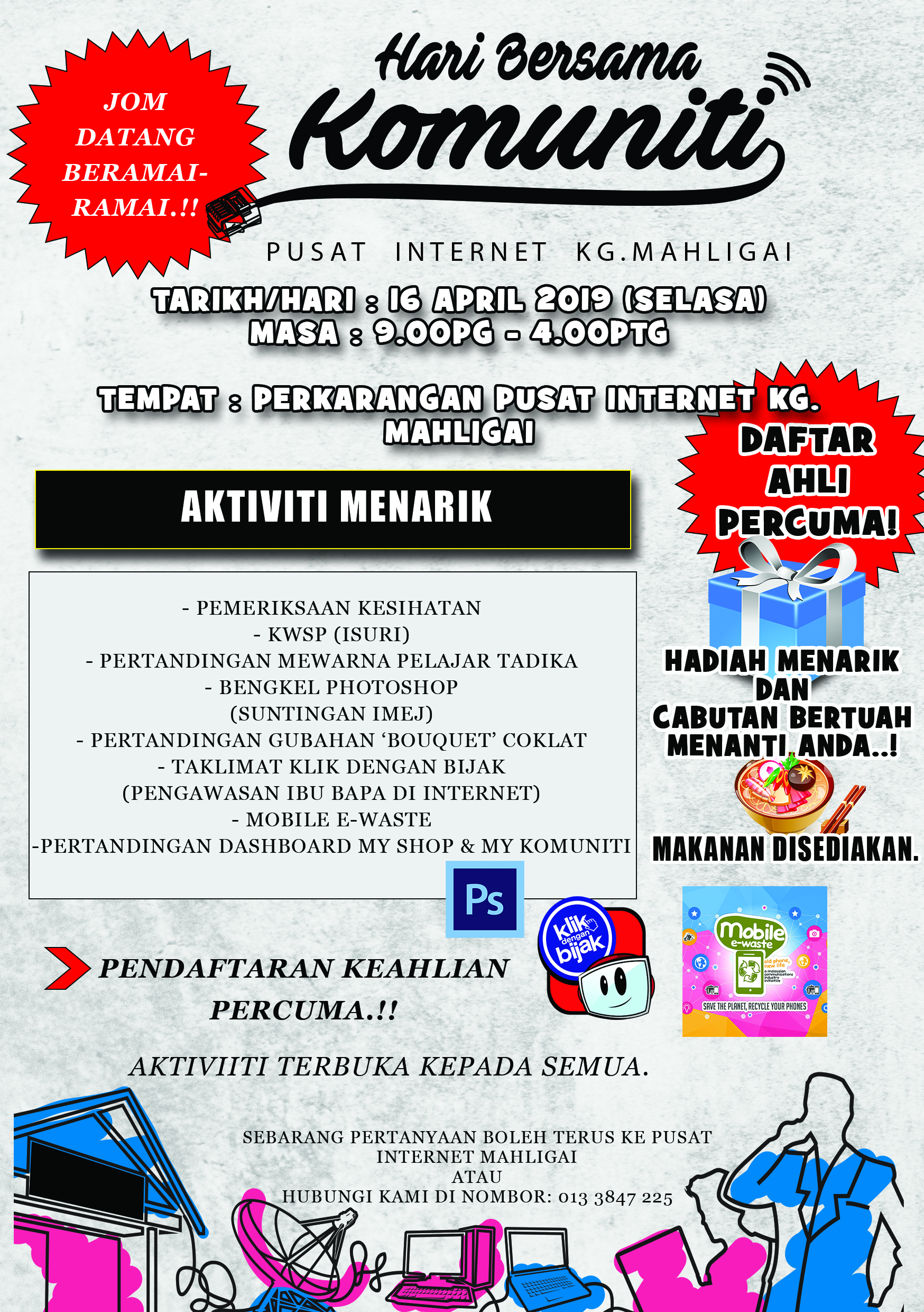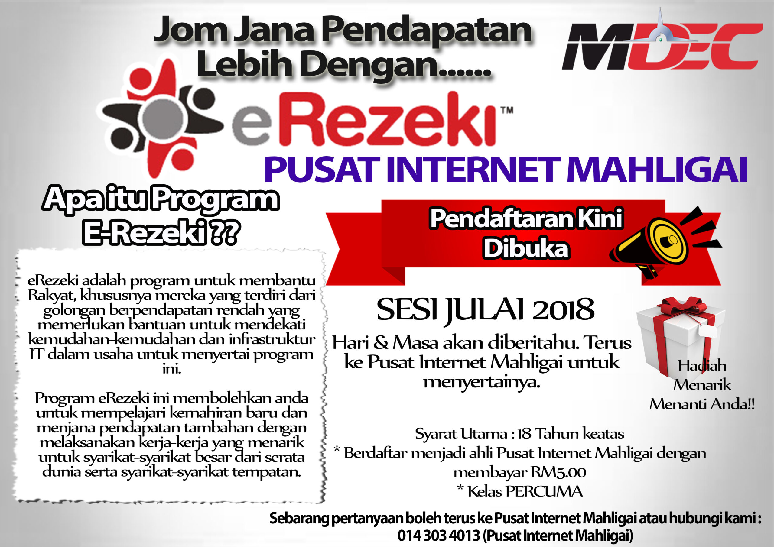 Dah bekerja tapi tidak cukup pendapatan dan ingin menjana pendapatan lebih secara sambilan?? Mari sertai program E-Rezeki yang akan diadakan di Pusat Ekonomi Digital Mahligai.. Berminat sila ke Pusat Ekonomi Digital Mahligai dan ketahui lebih lanjut mengenai E-Rezeki ini..