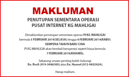 Untuk makluman, Pusat Internet Mahligai akan ditutup bermula pada hari Rabu (22 Ogos 2018) sehingga (23 Ogos 2018) sempena menyambut hari raya aidiladha.